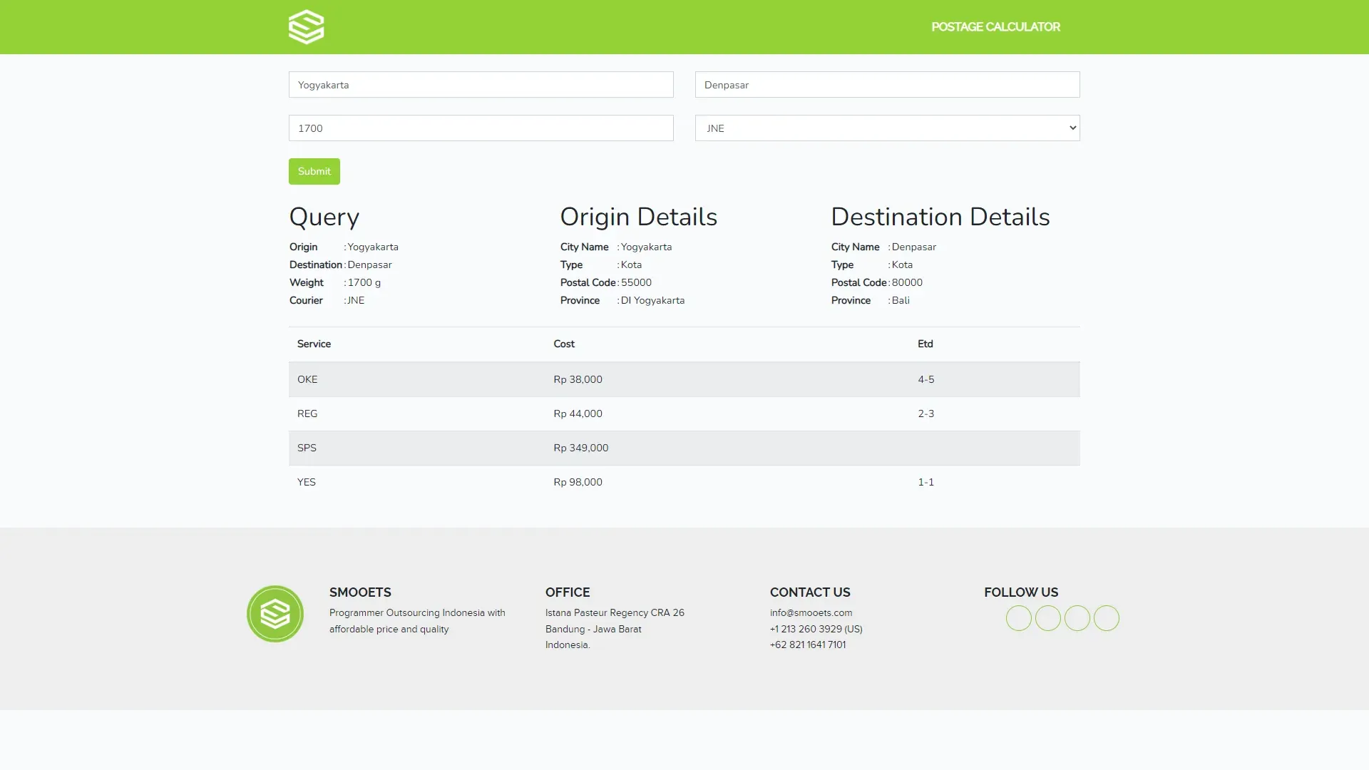 PT. Smooets Teknologi Outsourcing (Fullstack Internship)Postage CalculatorA postage calculator using Raja Ongkir API to calculate shipping costs in Indonesia.